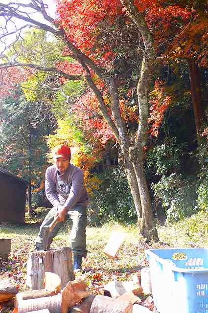裏山の紅葉を見ながら、夫婦で交替に薪を割っていきます。
