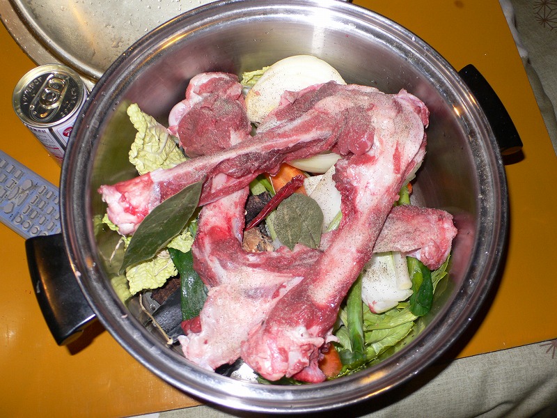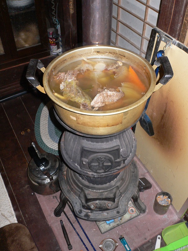 色々香味野菜と塩、香辛料、猪骨、猪脂をストーブでとろとろになるまで煮込む。
