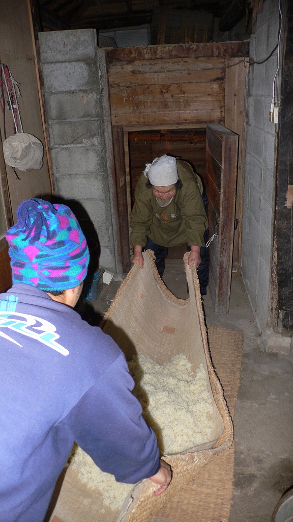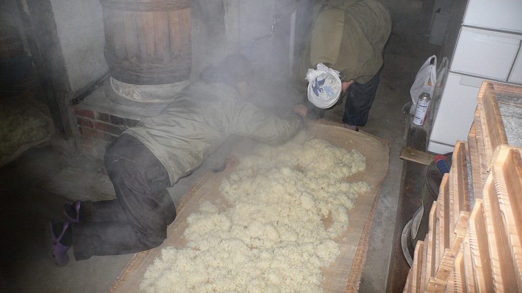 蒸しあがったら、麻布を敷いたムシロに米を乗せて広げ、麹菌を混ぜ込みます。